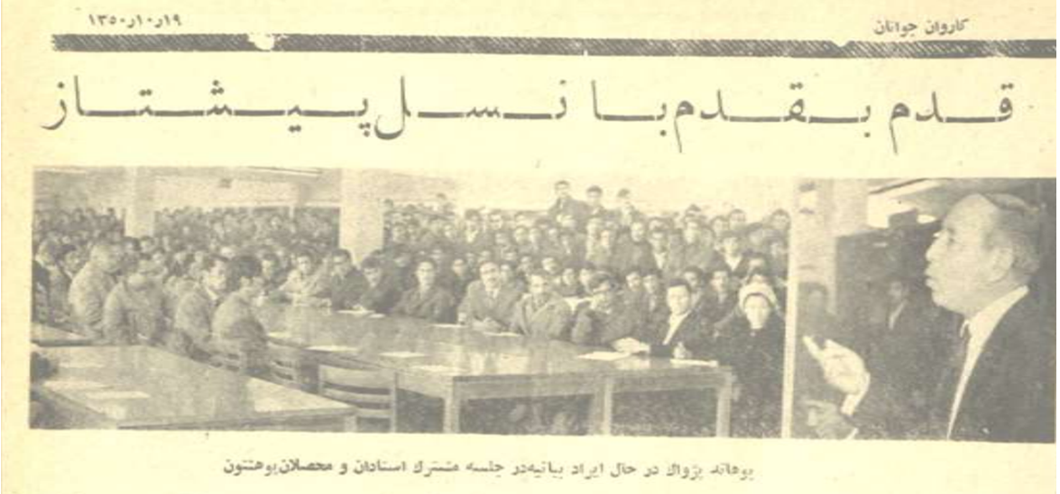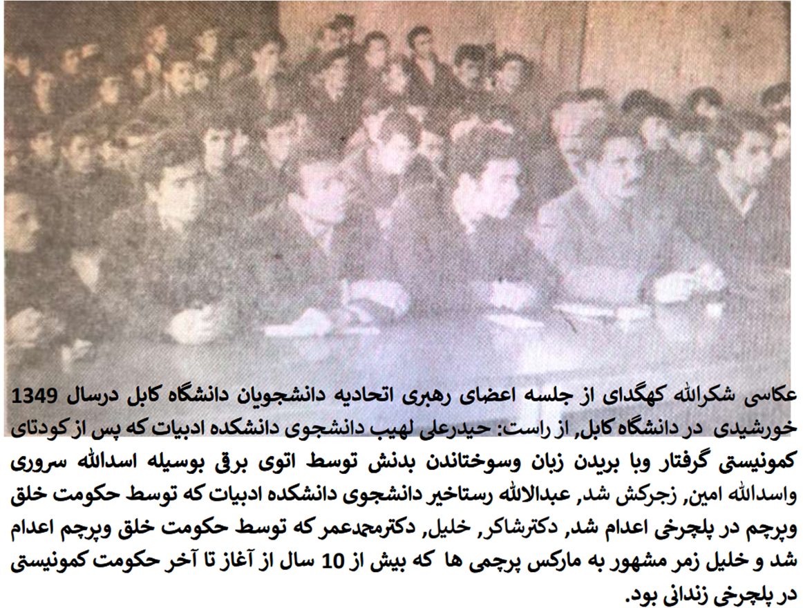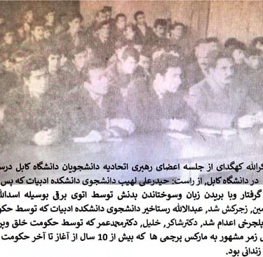 عکاسی: شکرالله کهگدای خبرنگار روزنامه کاروان/ سال 1348 خورشیدی/ کتابخانه دانشگاه کابل/ نشست اتحادیه استادان دانشگاه کابل, طرف راست(سگرت بدست) دکتر محمدحیدر استاد دانشکده حقوق که بدنبال کودتای سیاه داودخان دیکتاتور (26 سرطان 1352 خورشیدی) با برکناری فرهنگ سالار دکتر احمدجاوید رئیس انتخابی دانشگاه کابل, داود دیوانه, دکتر حیدر را رئیس انتصابی دانشگاه کابل مقررکرد مگر متوجه شد که پارسی زبان است , با اتهام بیجای برکنارش کرد . طرف چپ استادفضل الربی پژواک نخستین رئیس انتخابی دانشگاه کابل درسال 1348 خورشیدی که به دنبال تعطیل دانشگاه به مدت 6 ماه بخاطر کانکور زدگان, از چوکی ریاست دانشگاه استعفا داد وبا پا گرفتن اتحادیه استادان, بحیث رئیس اتحادیه استادان دانشگاه کابل برگزیده شد.