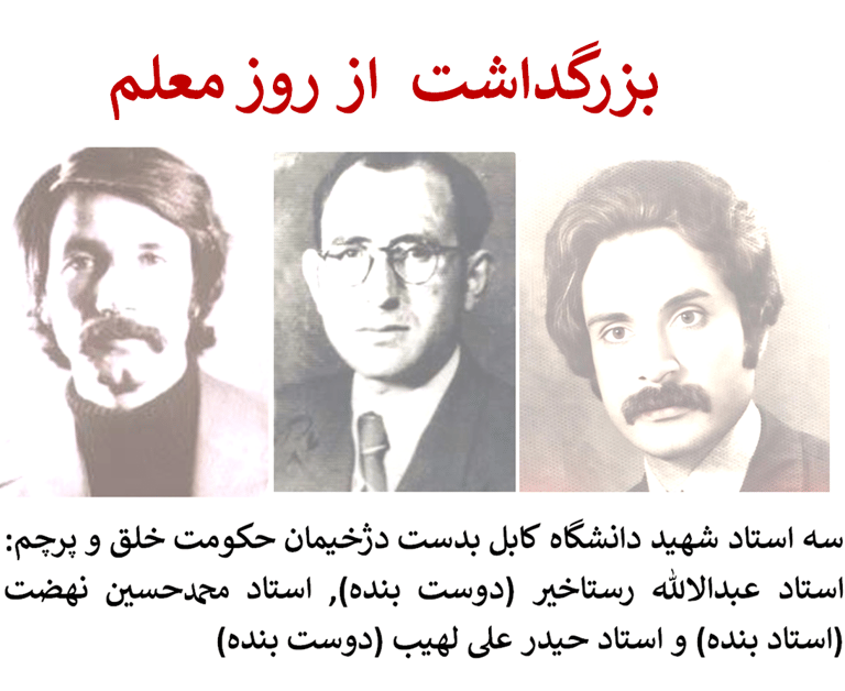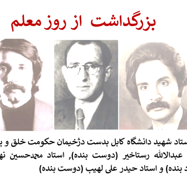اجازه بدهید دراین جا نامهای یک عده استادان دانشگاه کابل را که در حکومت جنایتکار تره کی – امین – کارمل و نجیب, گرفتار, شکنجه واعدام شدند یاد آوری نماییم تا یاد شان همیشه ماندگار وجاودانه باشد :